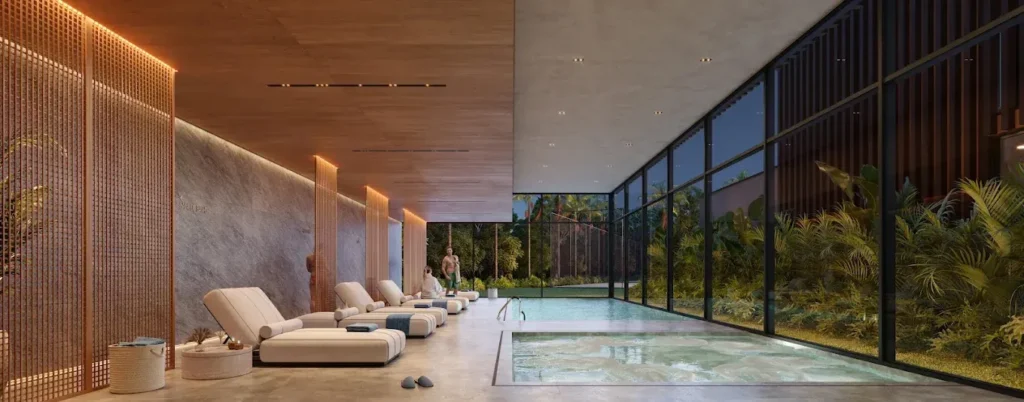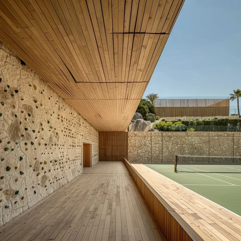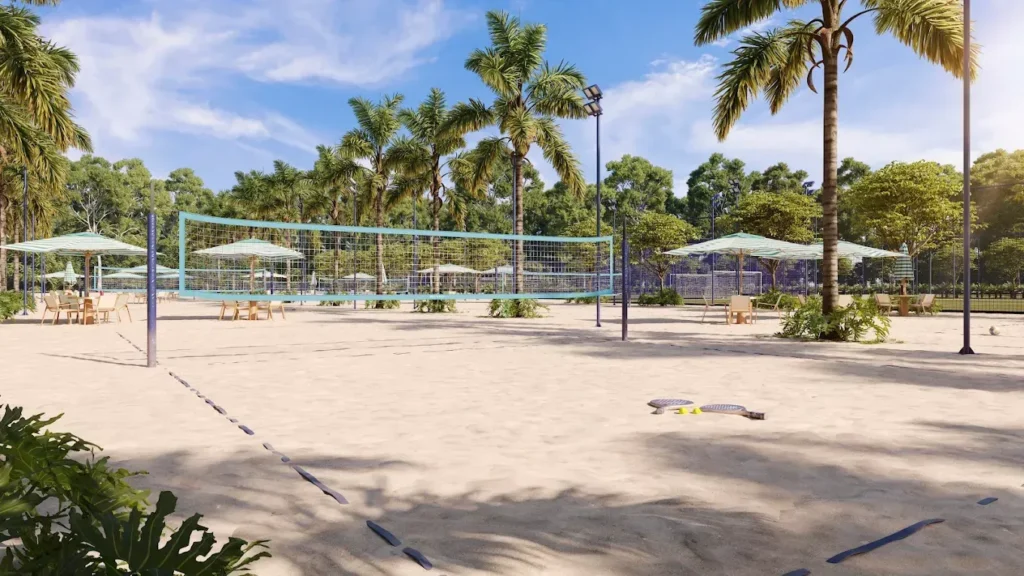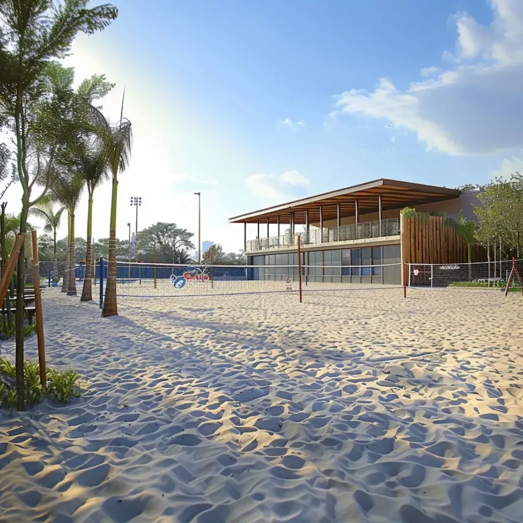 Na área esportiva e de entretenimento, o clube reúne uma estrutura abrangente, com modalidades que vão do surf ao skate, passando por bike, arena de lutas e um complexo indoor completo. Já no bem-estar, o projeto contempla spa, piscinas e áreas pensadas para desacelerar, além de uma arena central para até 3.000 pessoas, com possibilidade de expansão, e um conjunto completo de nove quadras distribuídas entre diferentes superfícies e usos.