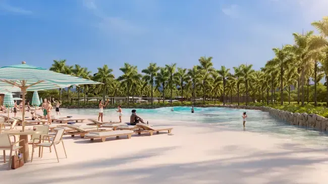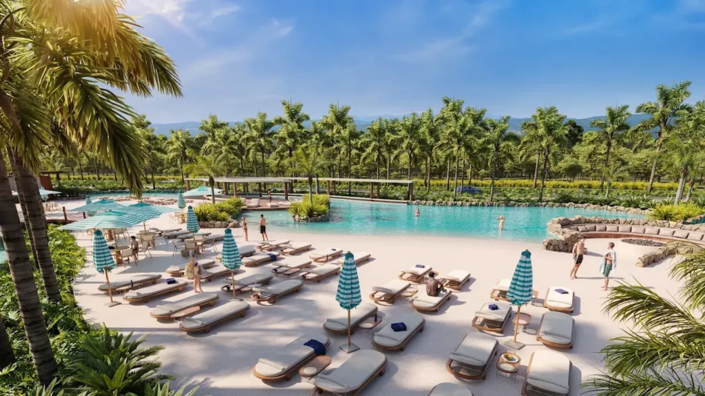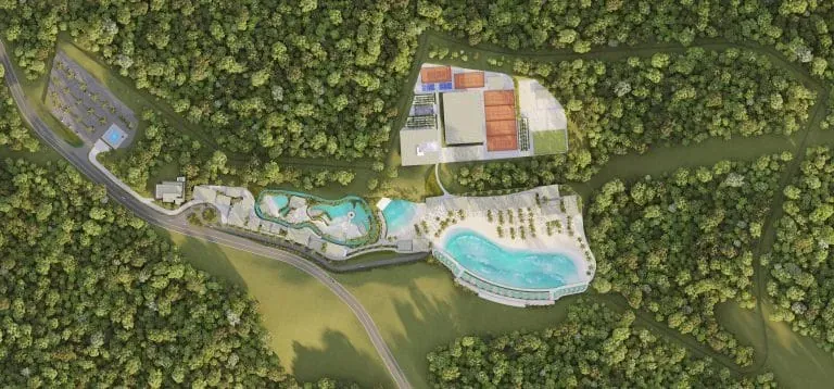 Um dos grandes destaques do empreendimento é a praia artificial com mais de 25 mil m², equipada com tecnologia Wave Bender, da Surf Loch, capaz de gerar diferentes tipos de ondas, atendendo desde iniciantes até surfistas mais experientes.