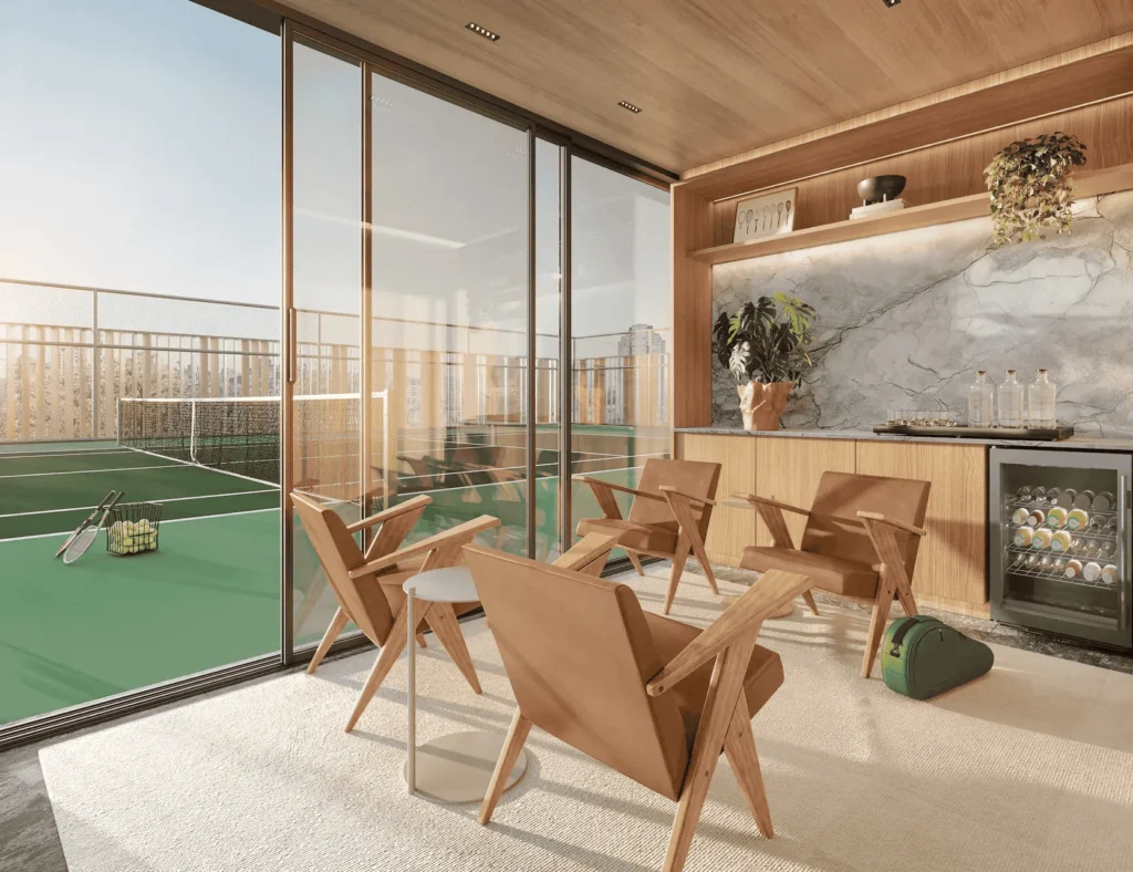 Além do Tennis Center, o clube contará com uma sede exclusiva voltada à experiência e ao convívio, com adega, charutaria, rooftop com restaurante, galeria de arte, espaços de permanência e serviços personalizados, como concierge e alfaiataria sob medida.